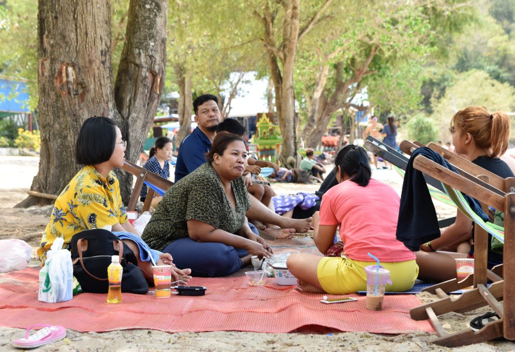 Aber solch schwere Gedanken dürften sich die wenigsten machen, die hier Erholung, Abwechslung, ein nasses Bad oder eine kühle Brise suchen. „Sanook“ – also diese besondere Form des thailändischen Wohlbefindens – und „Sabai“ – Lebensfreude und Genuss im Augenblick – stehen natürlich im Mittelpunkt des Strand-Tages. Zusammen mit der Familie, den Freunden oder den Arbeitskollegen genießt man ein paar Stunden „Urlaub“, denn mehrere Tage oder gar Wochen am Stück, wie wir es aus Mitteleuropa kennen, hat so gut wie kein Thai jemals frei. Ausnahme: die Zeit um das weltweite und die um das thailändische Neujahr im April. Und selbst da gilt für viele, die etwa im Tourismus oder anverwandten Branchen arbeiten, dass nicht Urlaub angesagt ist, sondern im Gegenteil: Hochsaison!